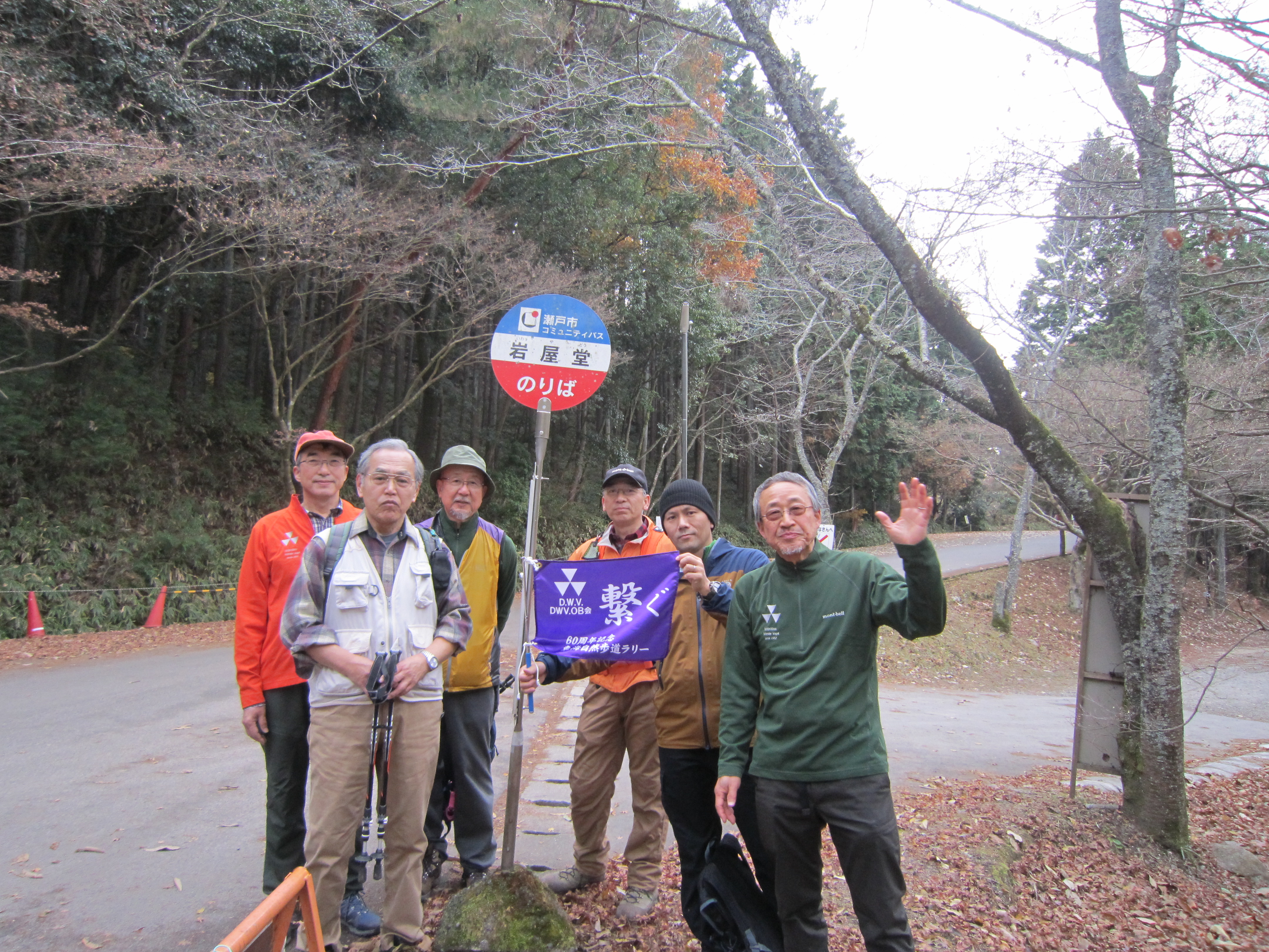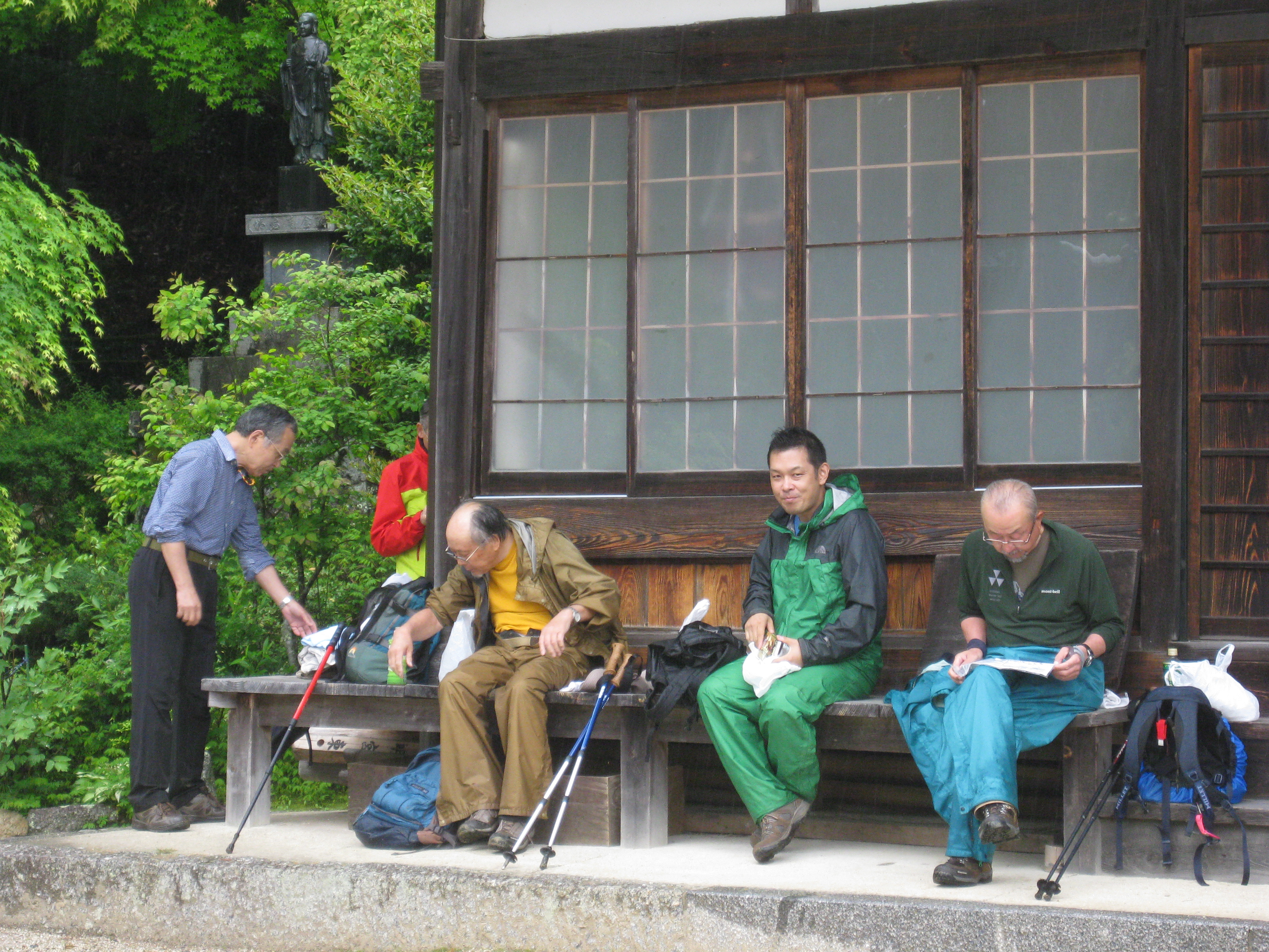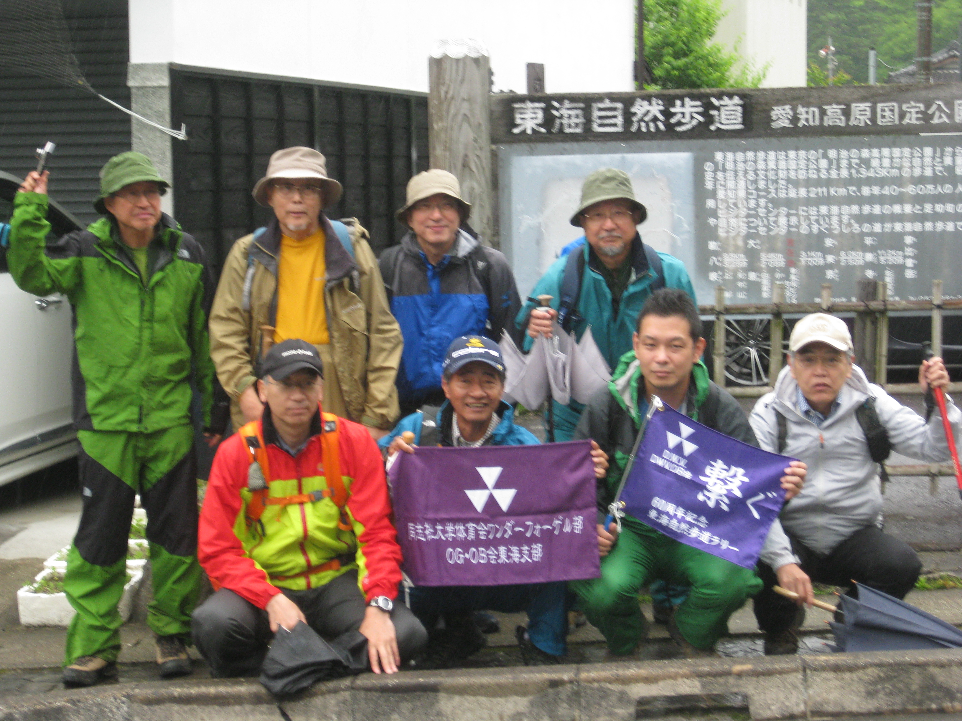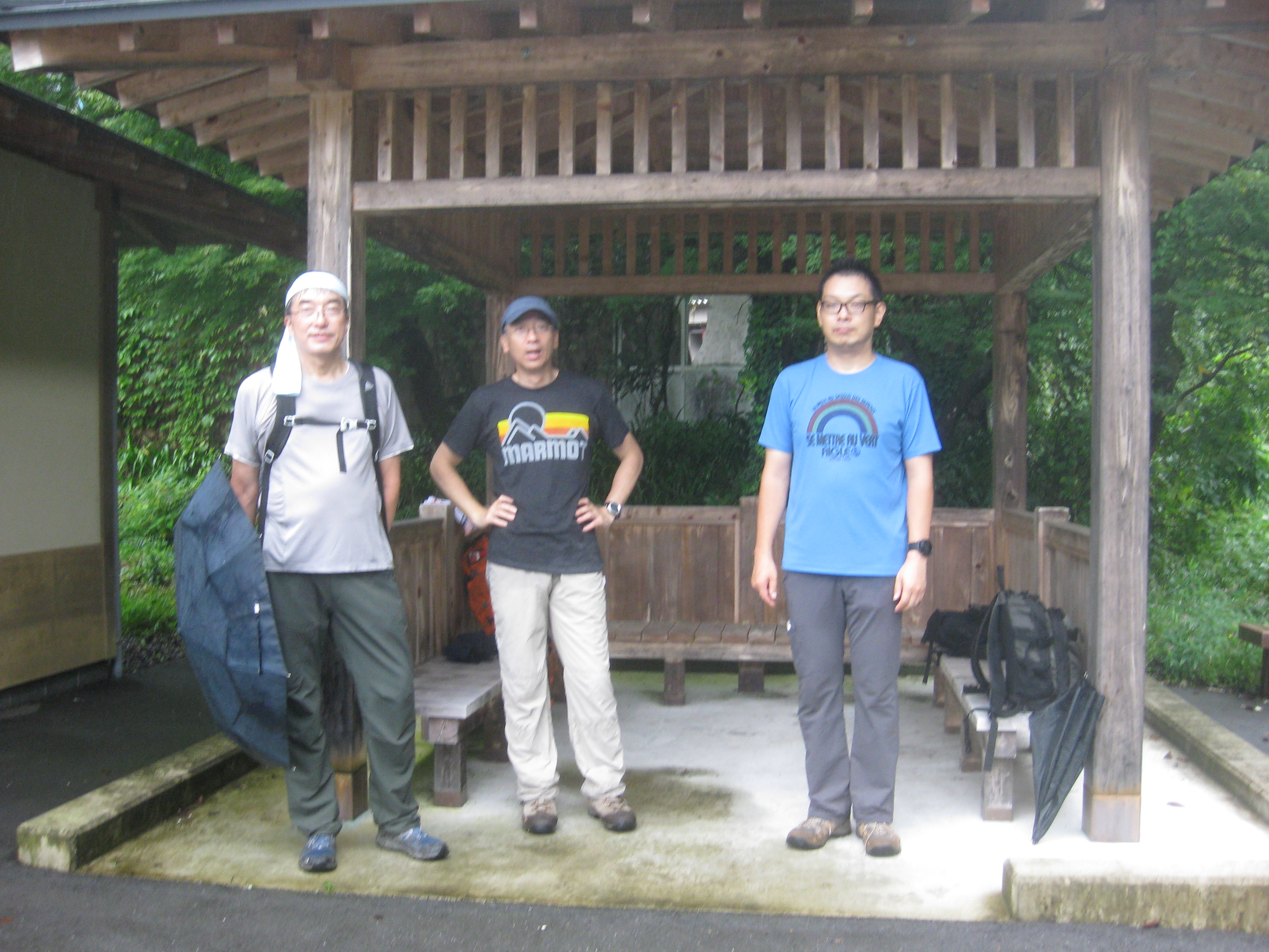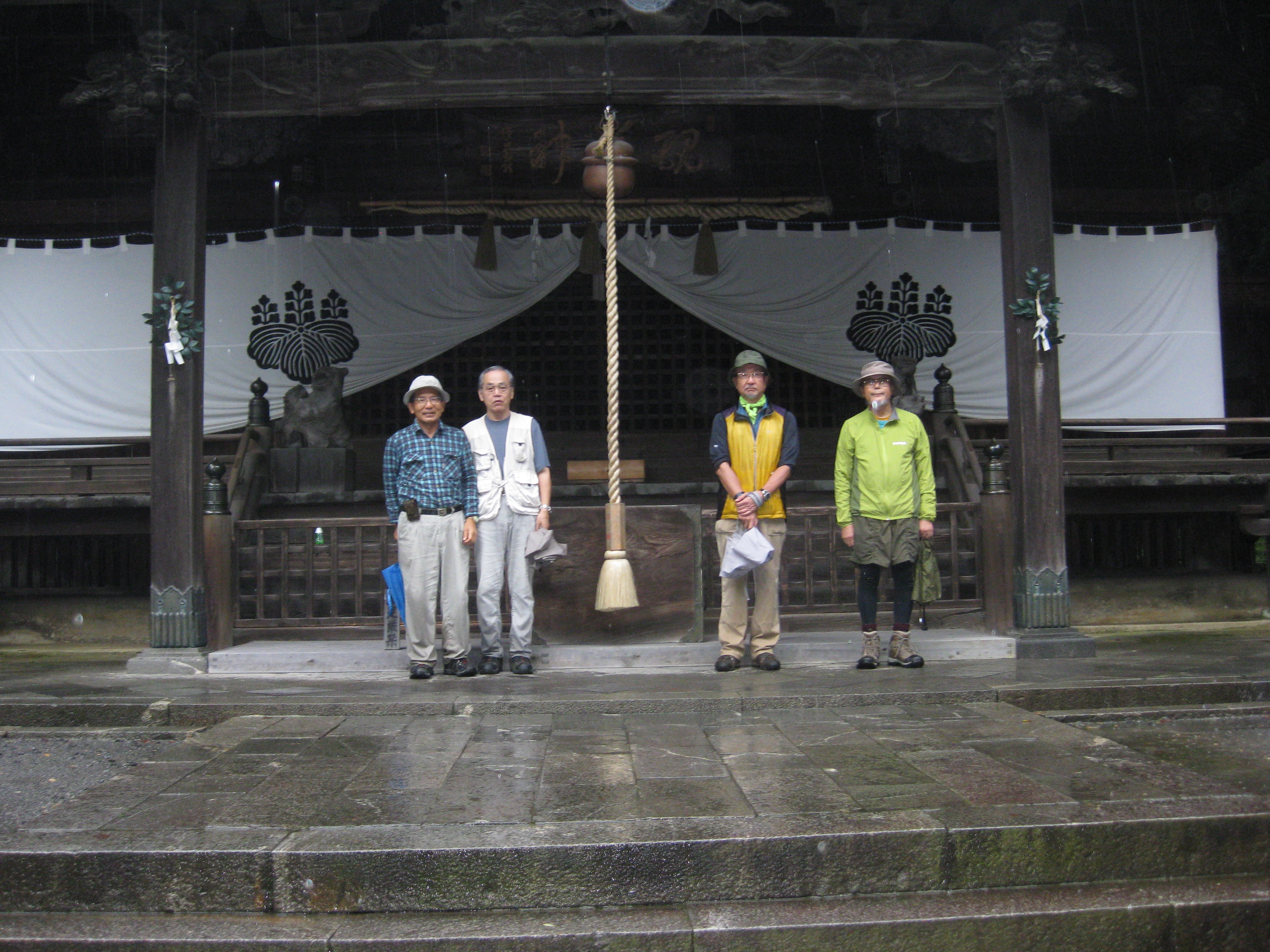 前回ゴールの足助八幡宮前に9時30分集合、予報より早く雨が降っている。8回実施中3回が雨、誰が雨男か! 9時45分出発、10時20分安実京町到着する。ここまではロード。ここから山道に入いり高度を稼ぐ。再びロードとなり外国人女性の単独ハイカーとすれ違い、地元の人に「頑張って」と声をかけられる。老さわらの巨木を過ぎ、11時10分室口町分岐に出、公民館の軒先にてダウン。雨の降り続く中を12時30分平勝寺到着、ここでも本堂軒先をお借りして腹ごしらえする。予定より順調なため金蔵連峠でのタクシーを1時間早めの15時に変更連絡を入れる。12時55分出発、ロード・山道を繰り返す。山道は雨水が流れ、さながら川の様相をなしている。13時50分金蔵連峠まで50分の表示がある道標にて最後のダウン。14時45分真新しいトイレのある金蔵連峠に到着する。すぐにタクシーが到着し、足助バス停に向かう。