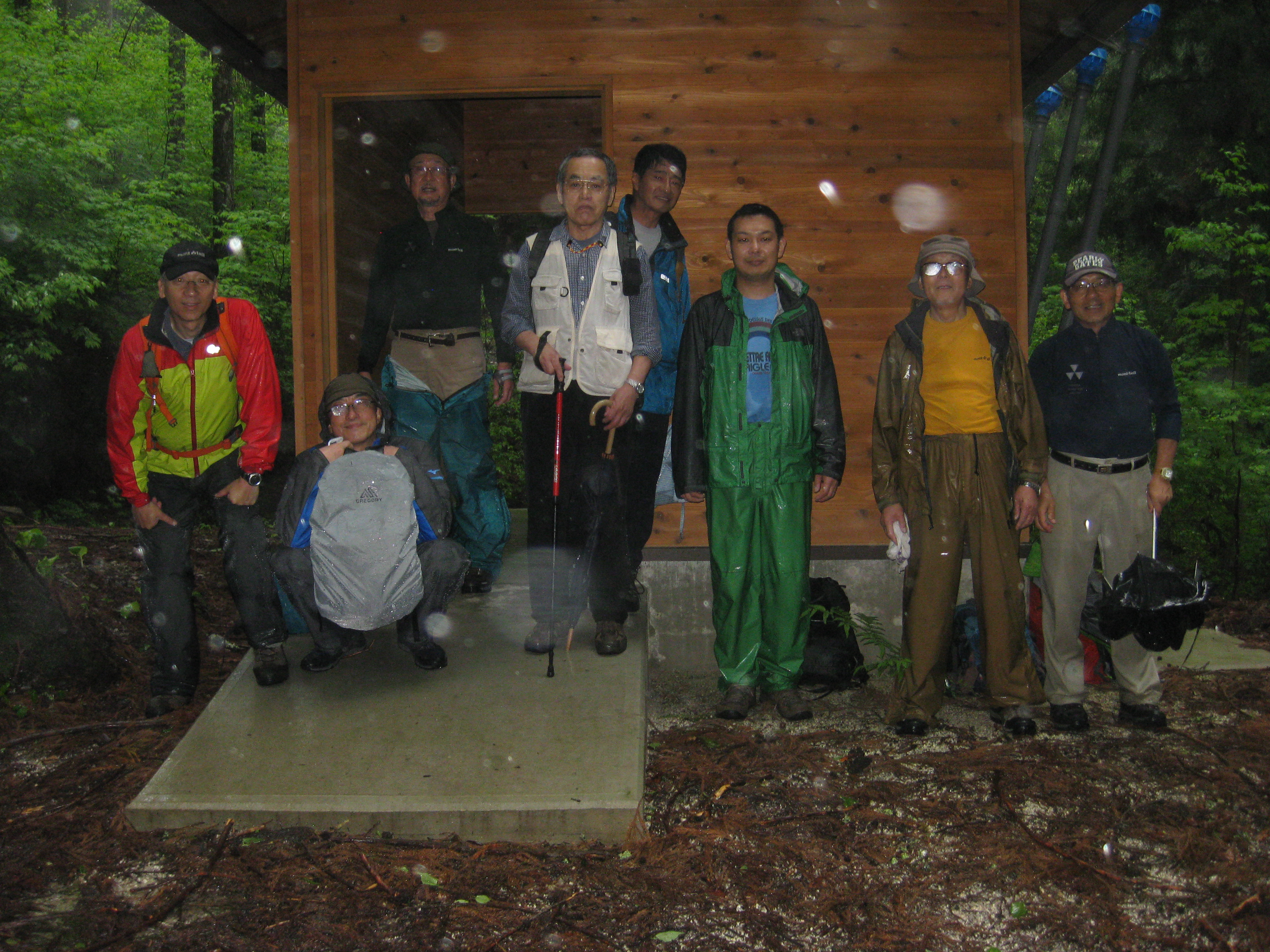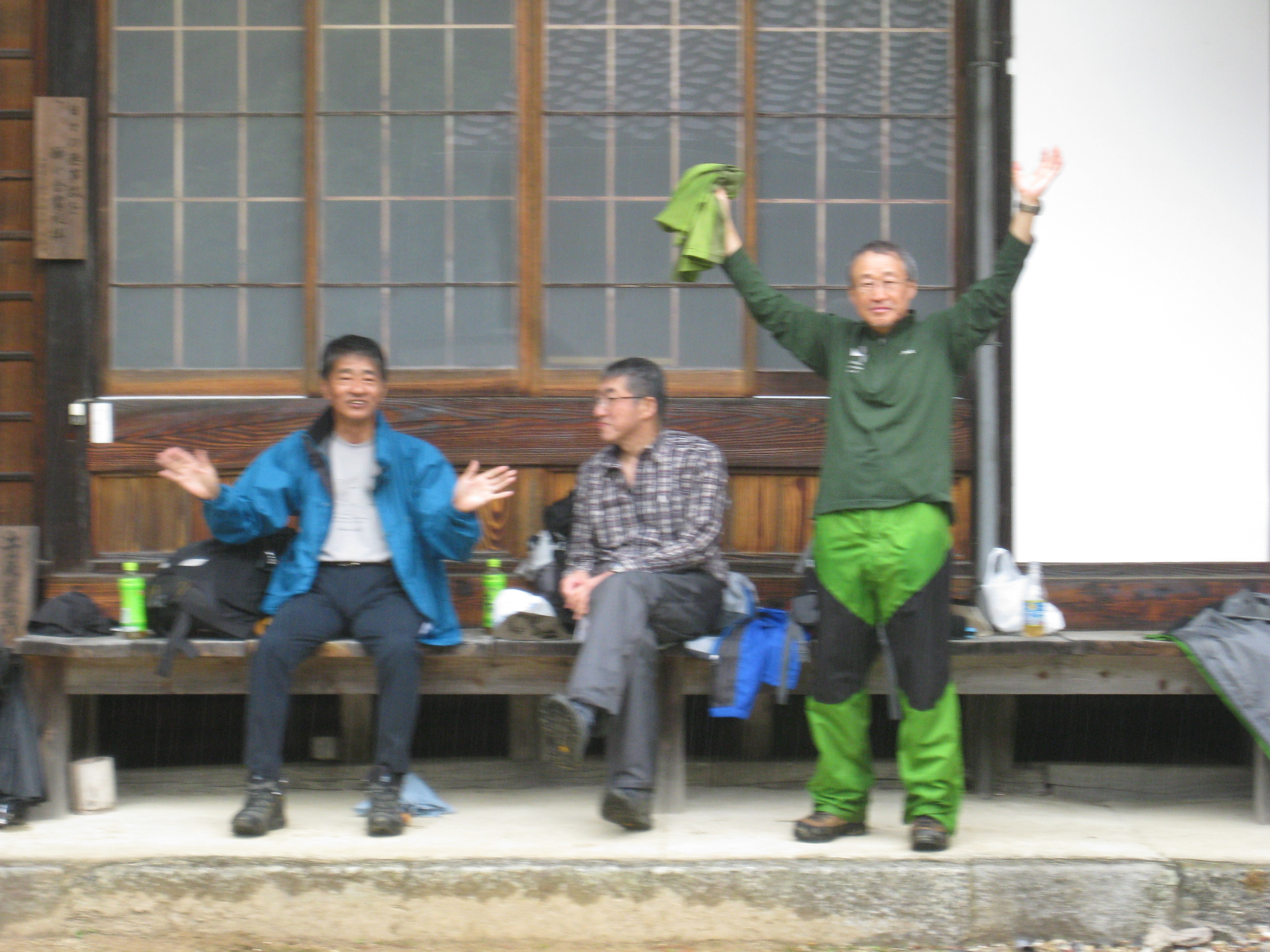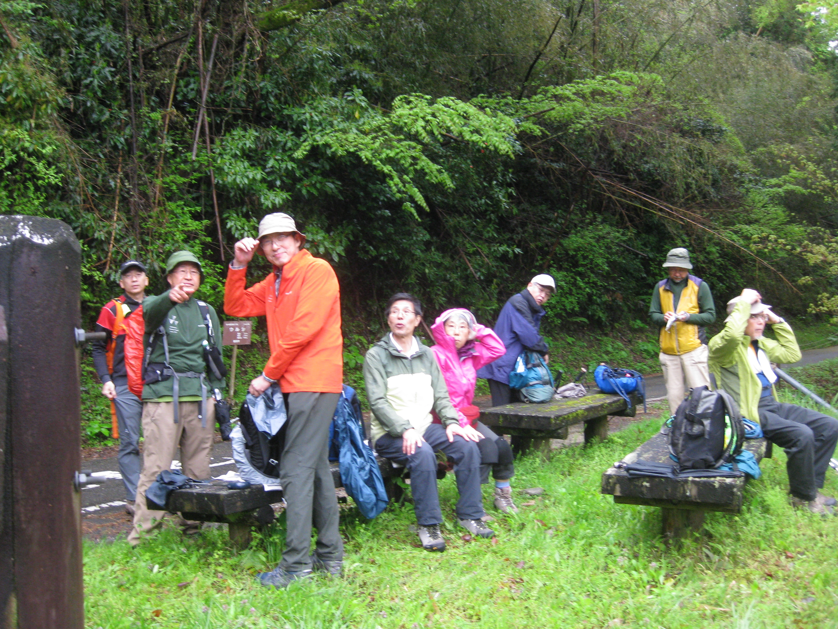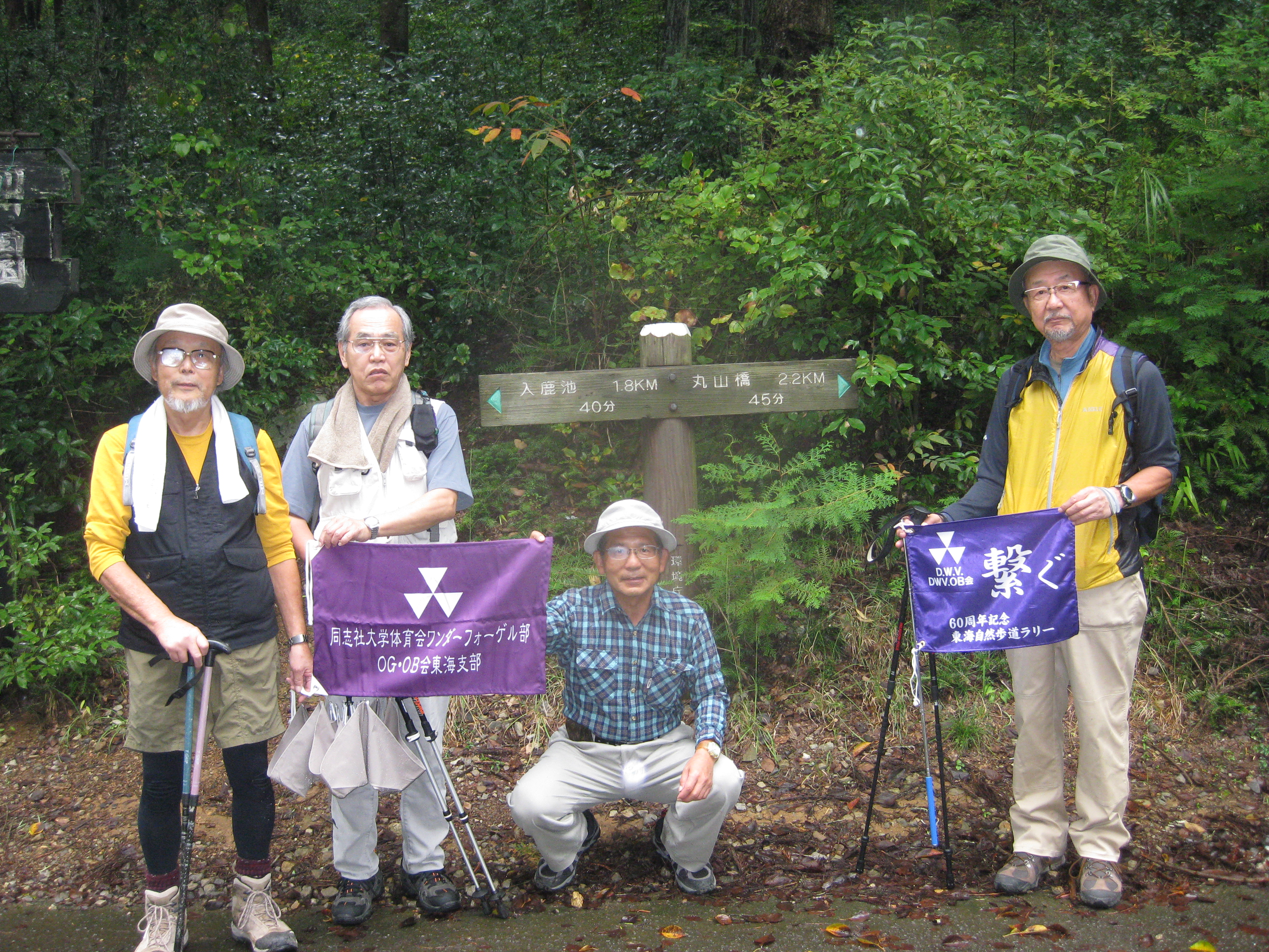 前回ゴールの足助八幡宮前に9時30分集合、予報より早く雨が降っている。8回実施中3回が雨、誰が雨男か! 9時45分出発、10時20分安実京町到着する。ここまではロード。ここから山道に入いり高度を稼ぐ。再びロードとなり外国人女性の単独ハイカーとすれ違い、地元の人に「頑張って」と声をかけられる。老さわらの巨木を過ぎ、11時10分室口町分岐に出、公民館の軒先にてダウン。雨の降り続く中を12時30分平勝寺到着、ここでも本堂軒先をお借りして腹ごしらえする。予定より順調なため金蔵連峠でのタクシーを1時間早めの15時に変更連絡を入れる。12時55分出発、ロード・山道を繰り返す。山道は雨水が流れ、さながら川の様相をなしている。13時50分金蔵連峠まで50分の表示がある道標にて最後のダウン。14時45分真新しいトイレのある金蔵連峠に到着する。すぐにタクシーが到着し、足助バス停に向かう。
