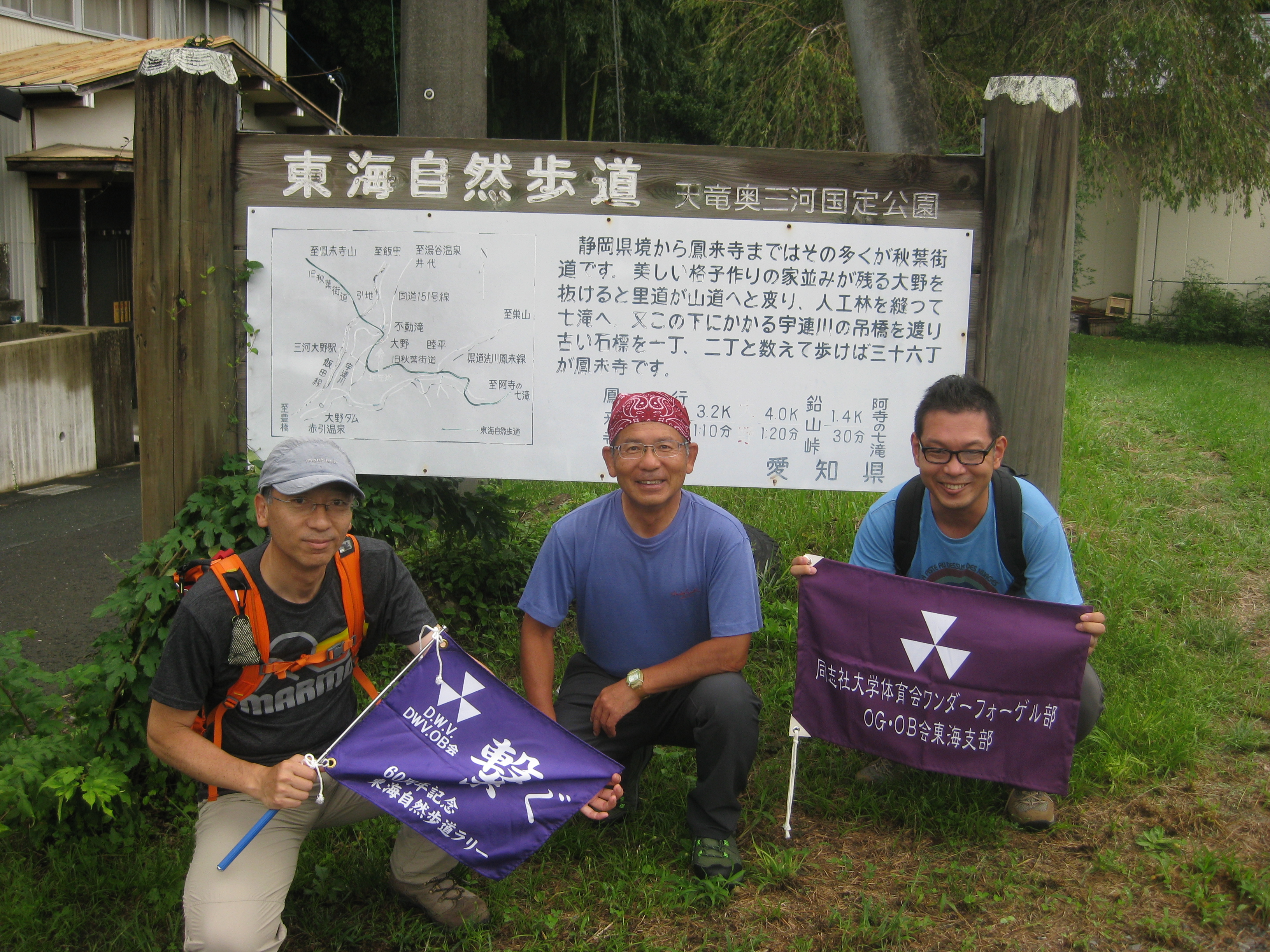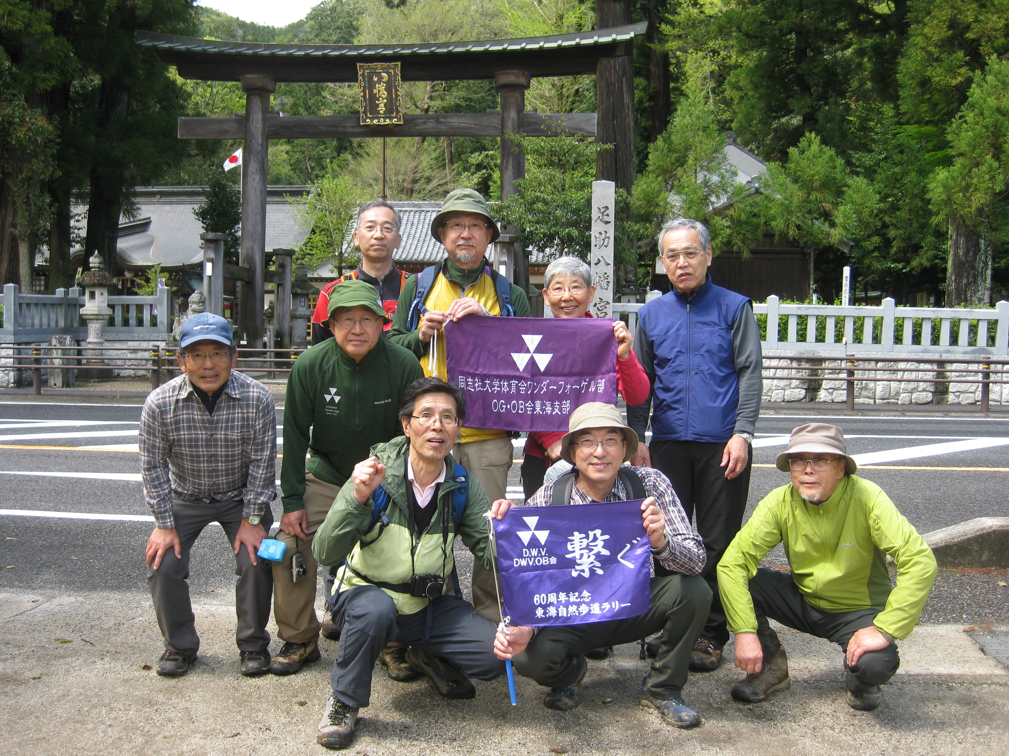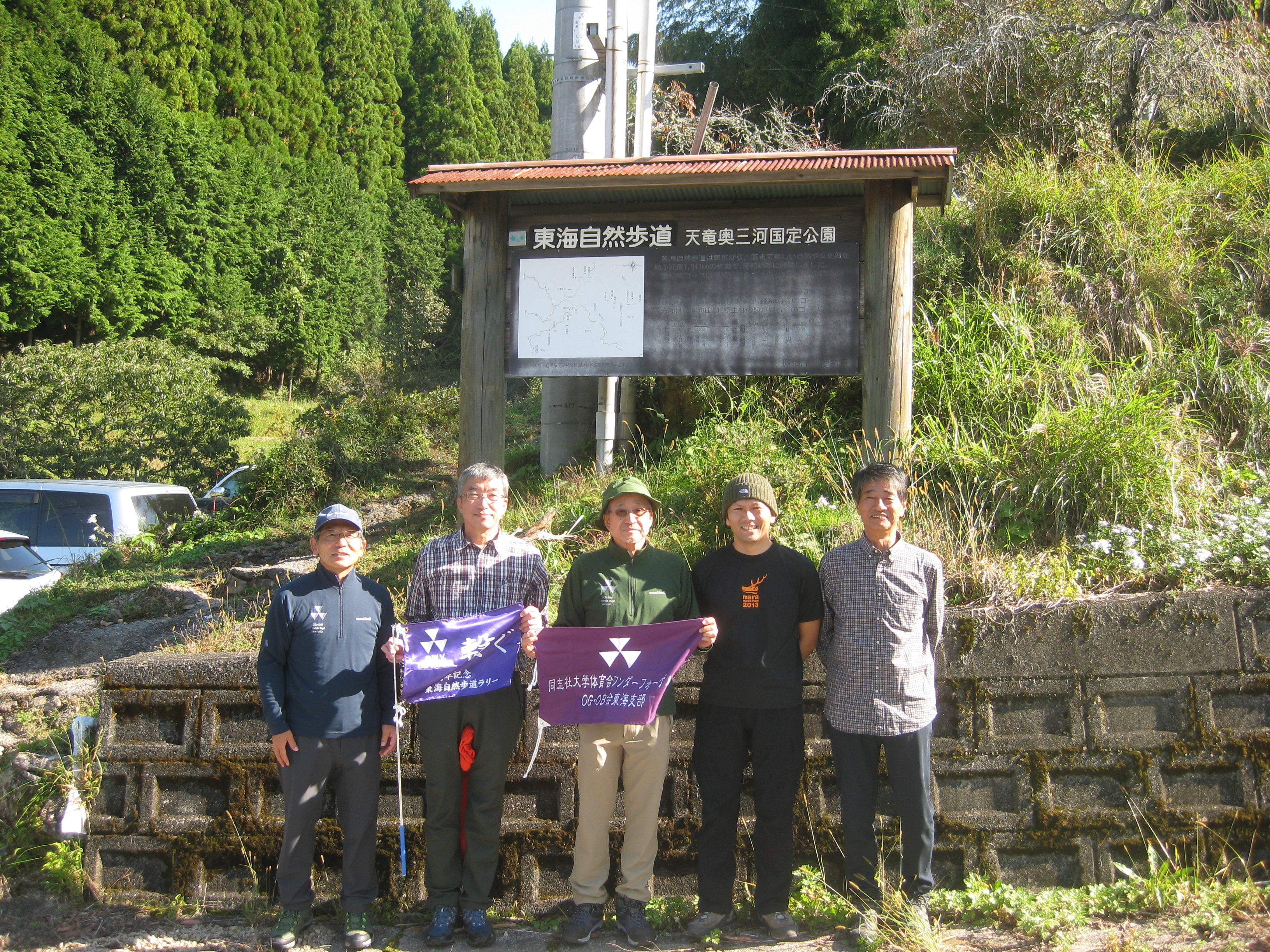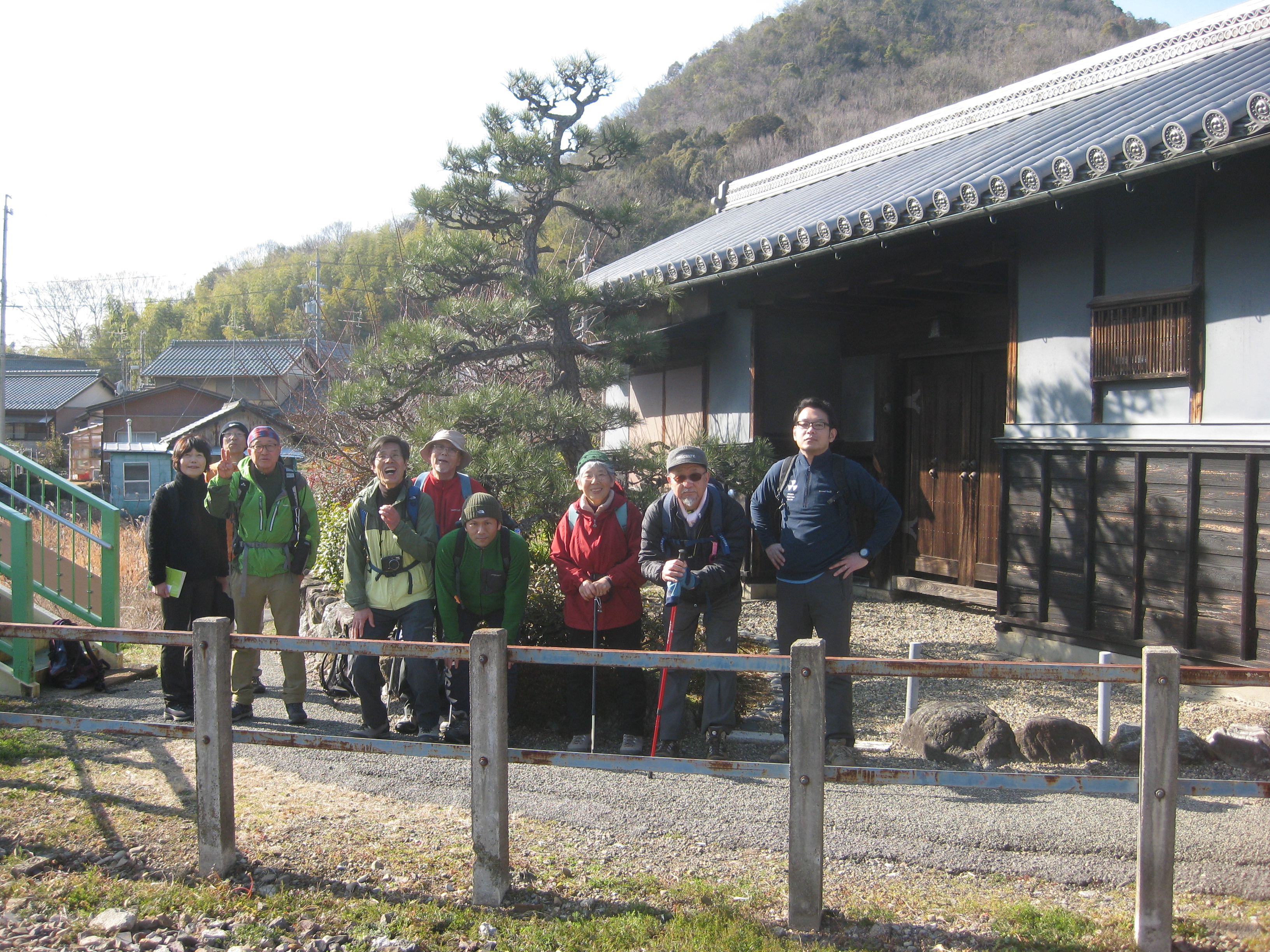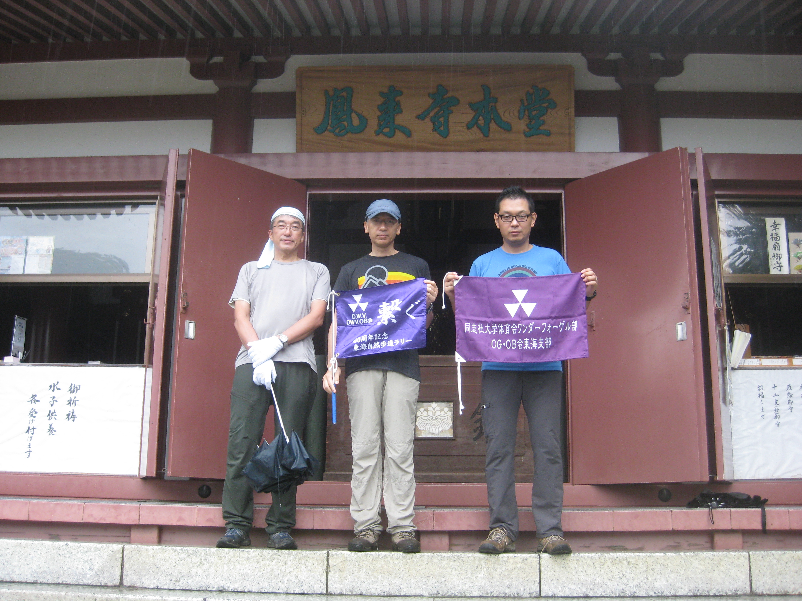 前回ゴールの足助八幡宮前に9時30分集合、予報より早く雨が降っている。8回実施中3回が雨、誰が雨男か! 9時45分出発、10時20分安実京町到着する。ここまではロード。ここから山道に入いり高度を稼ぐ。再びロードとなり外国人女性の単独ハイカーとすれ違い、地元の人に「頑張って」と声をかけられる。老さわらの巨木を過ぎ、11時10分室口町分岐に出、公民館の軒先にてダウン。雨の降り続く中を12時30分平勝寺到着、ここでも本堂軒先をお借りして腹ごしらえする。予定より順調なため金蔵連峠でのタクシーを1時間早めの15時に変更連絡を入れる。12時55分出発、ロード・山道を繰り返す。山道は雨水が流れ、さながら川の様相をなしている。13時50分金蔵連峠まで50分の表示がある道標にて最後のダウン。14時45分真新しいトイレのある金蔵連峠に到着する。すぐにタクシーが到着し、足助バス停に向かう。