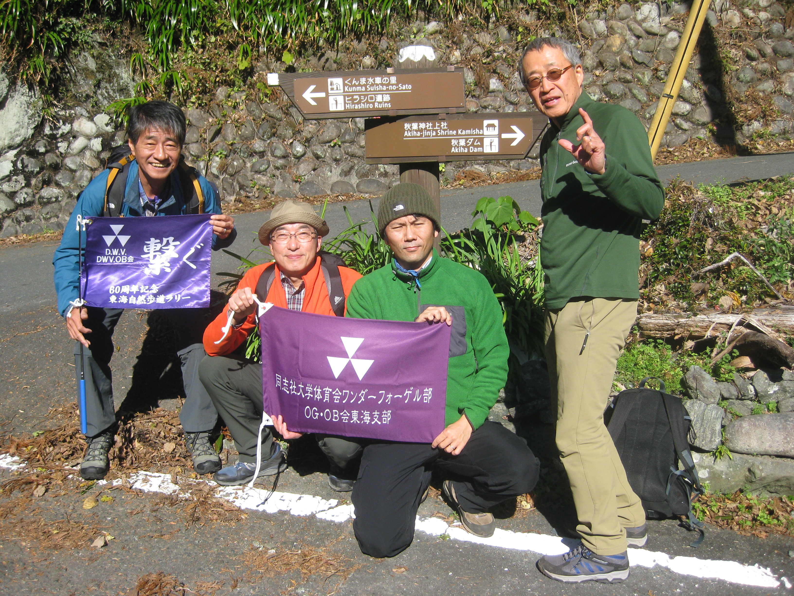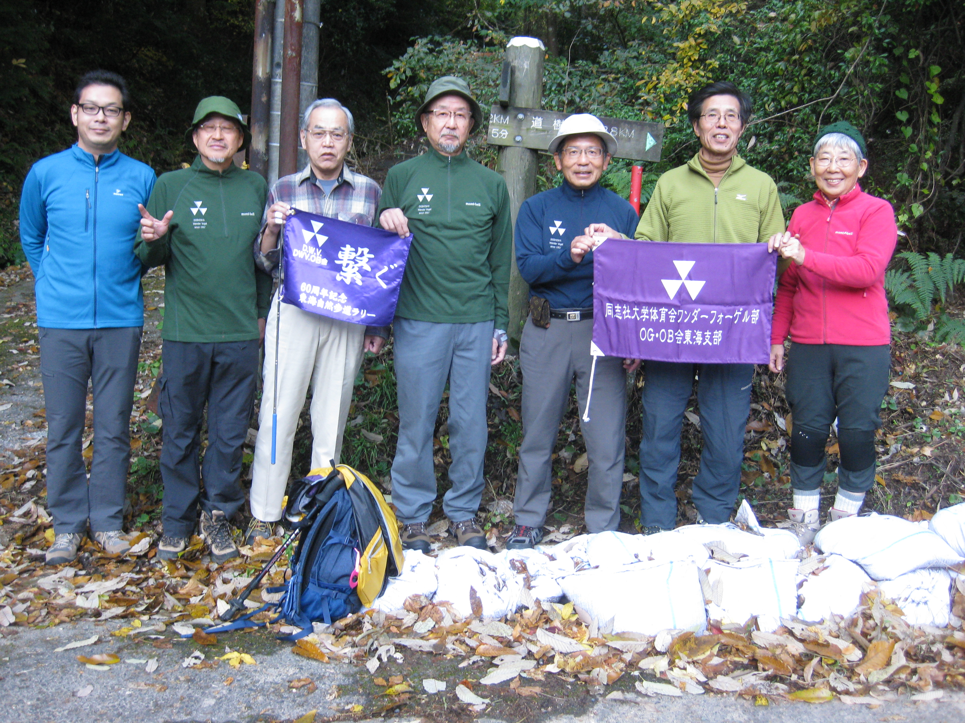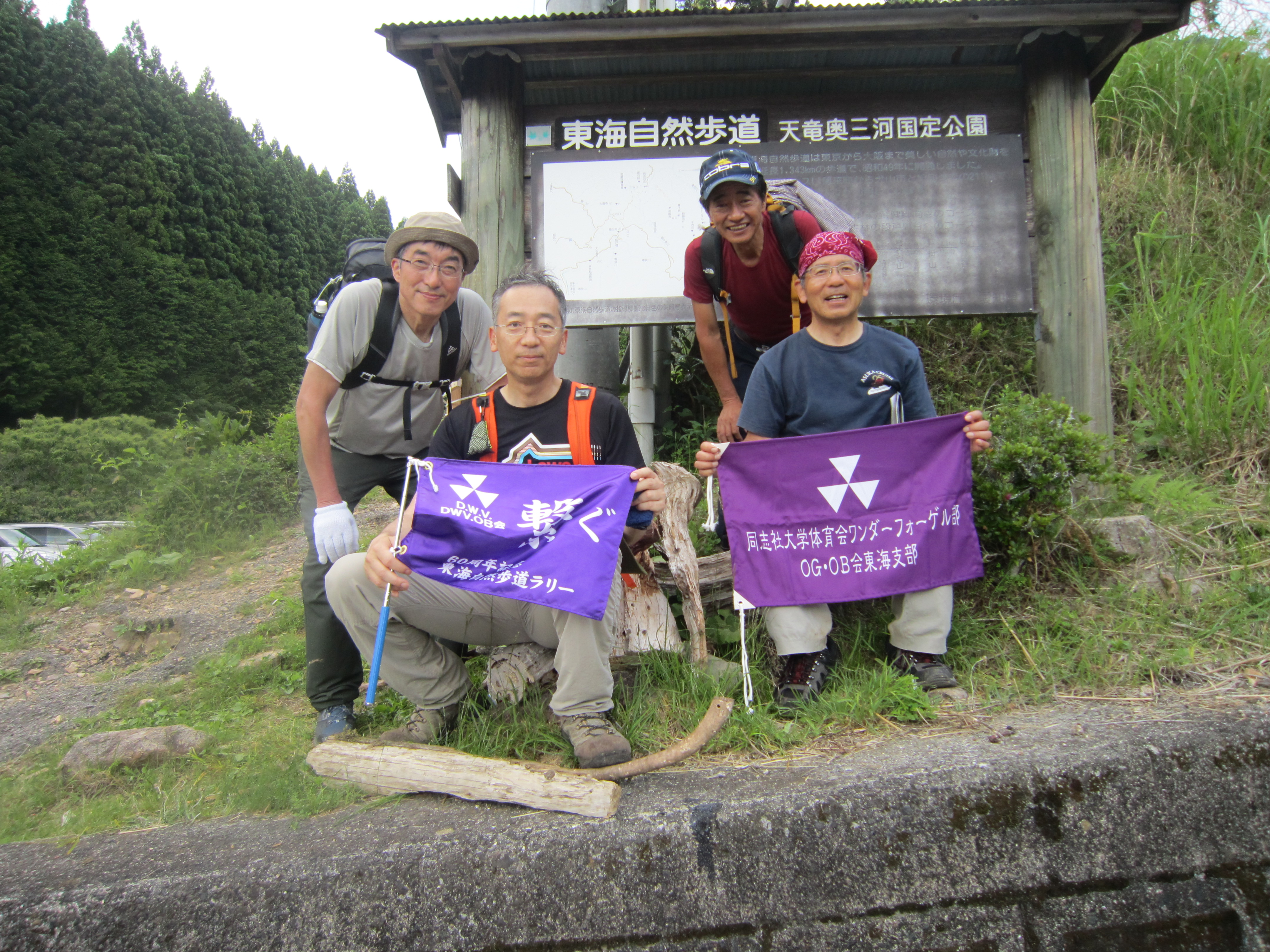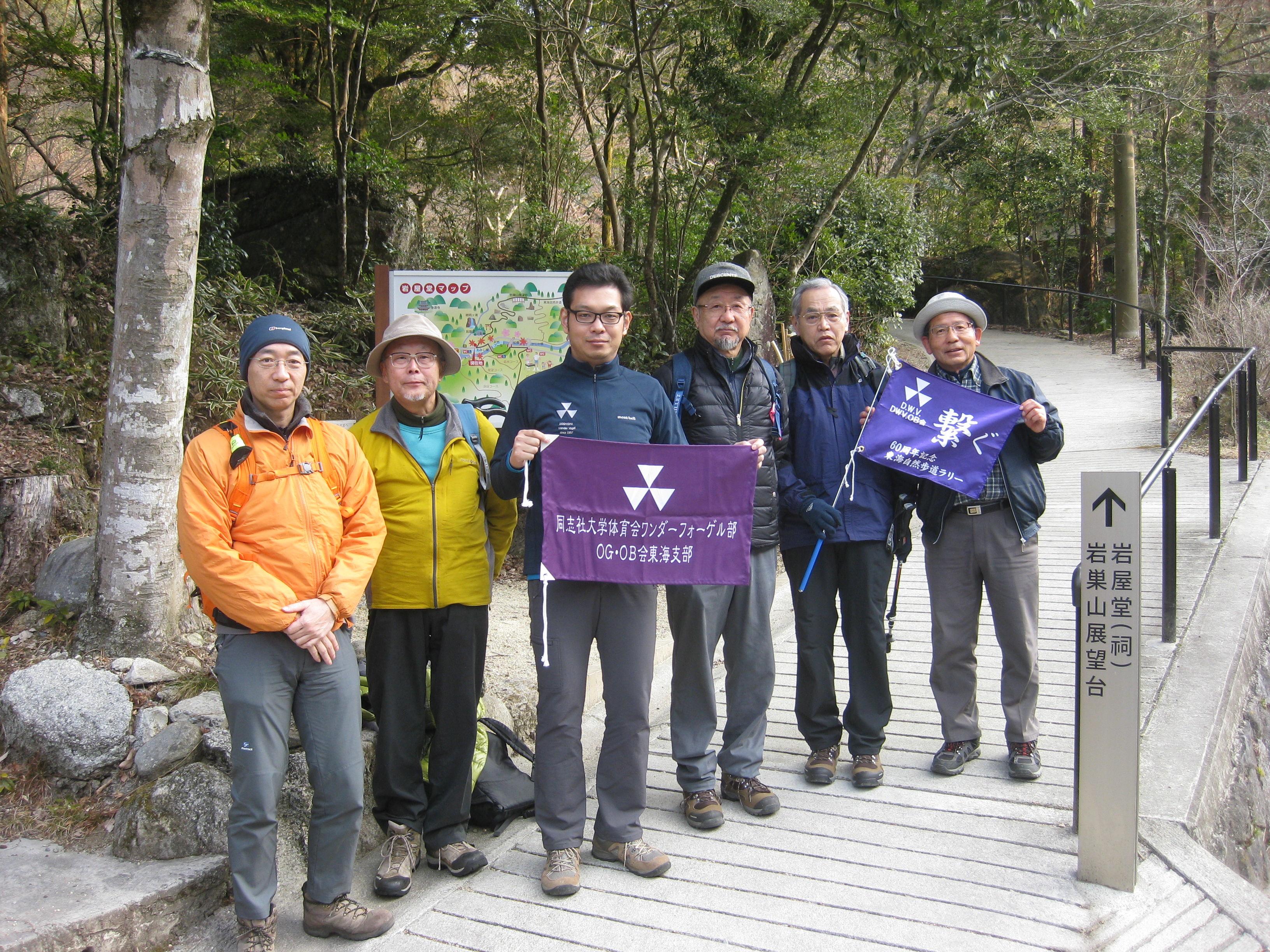 前回ゴールの足助八幡宮前に9時30分集合、予報より早く雨が降っている。8回実施中3回が雨、誰が雨男か! 9時45分出発、10時20分安実京町到着する。ここまではロード。ここから山道に入いり高度を稼ぐ。再びロードとなり外国人女性の単独ハイカーとすれ違い、地元の人に「頑張って」と声をかけられる。老さわらの巨木を過ぎ、11時10分室口町分岐に出、公民館の軒先にてダウン。雨の降り続く中を12時30分平勝寺到着、ここでも本堂軒先をお借りして腹ごしらえする。予定より順調なため金蔵連峠でのタクシーを1時間早めの15時に変更連絡を入れる。12時55分出発、ロード・山道を繰り返す。山道は雨水が流れ、さながら川の様相をなしている。13時50分金蔵連峠まで50分の表示がある道標にて最後のダウン。14時45分真新しいトイレのある金蔵連峠に到着する。すぐにタクシーが到着し、足助バス停に向かう。