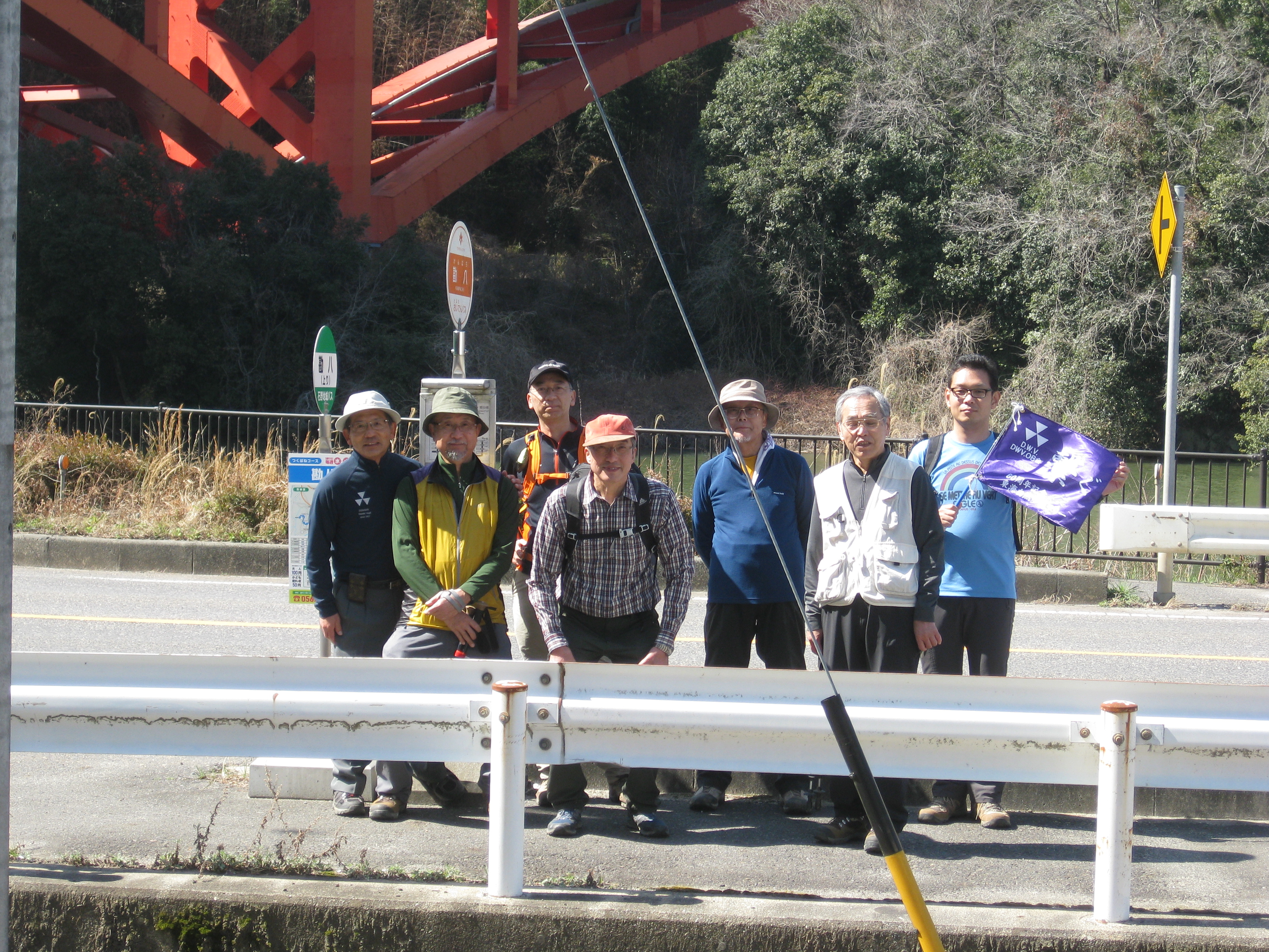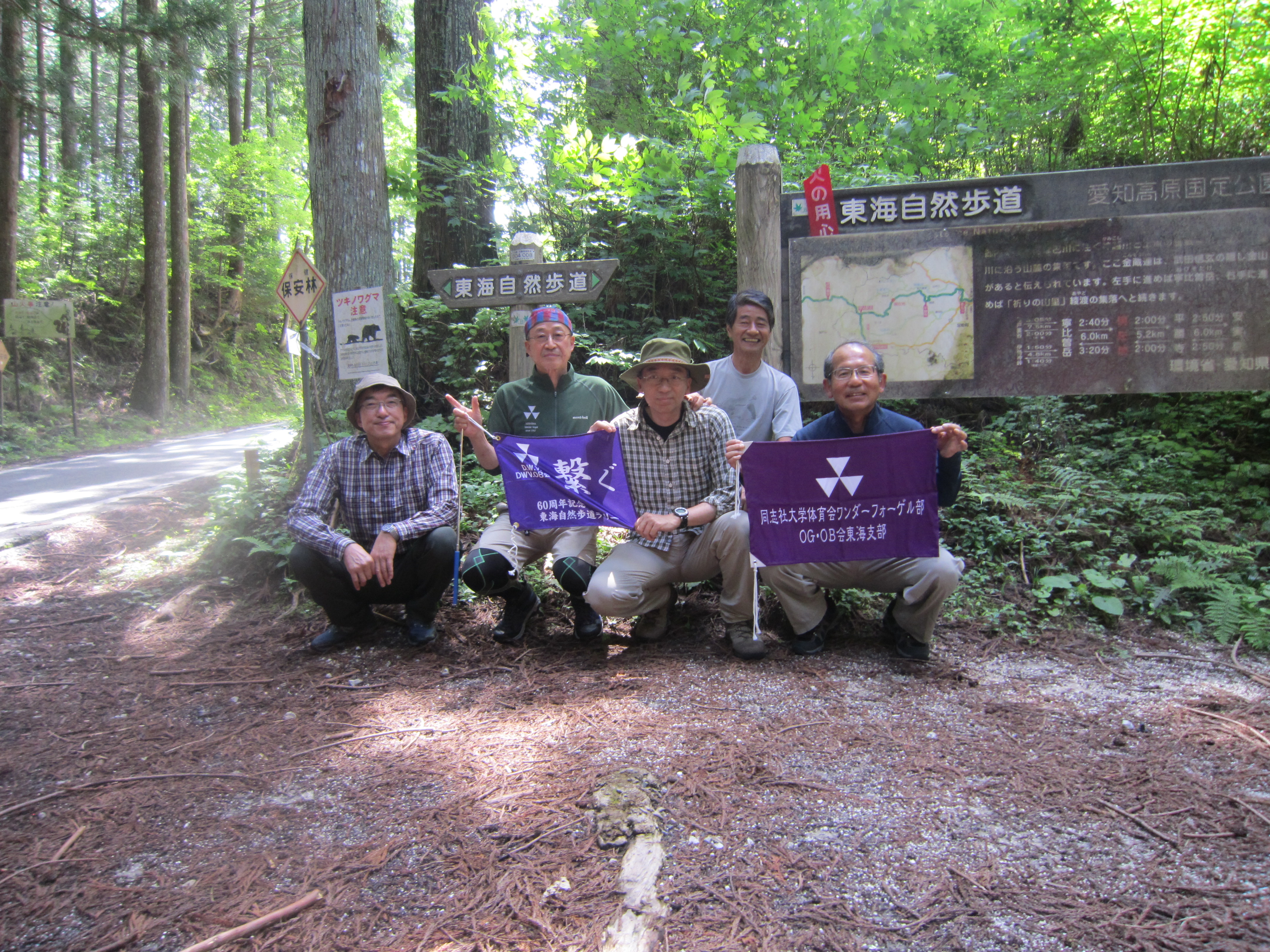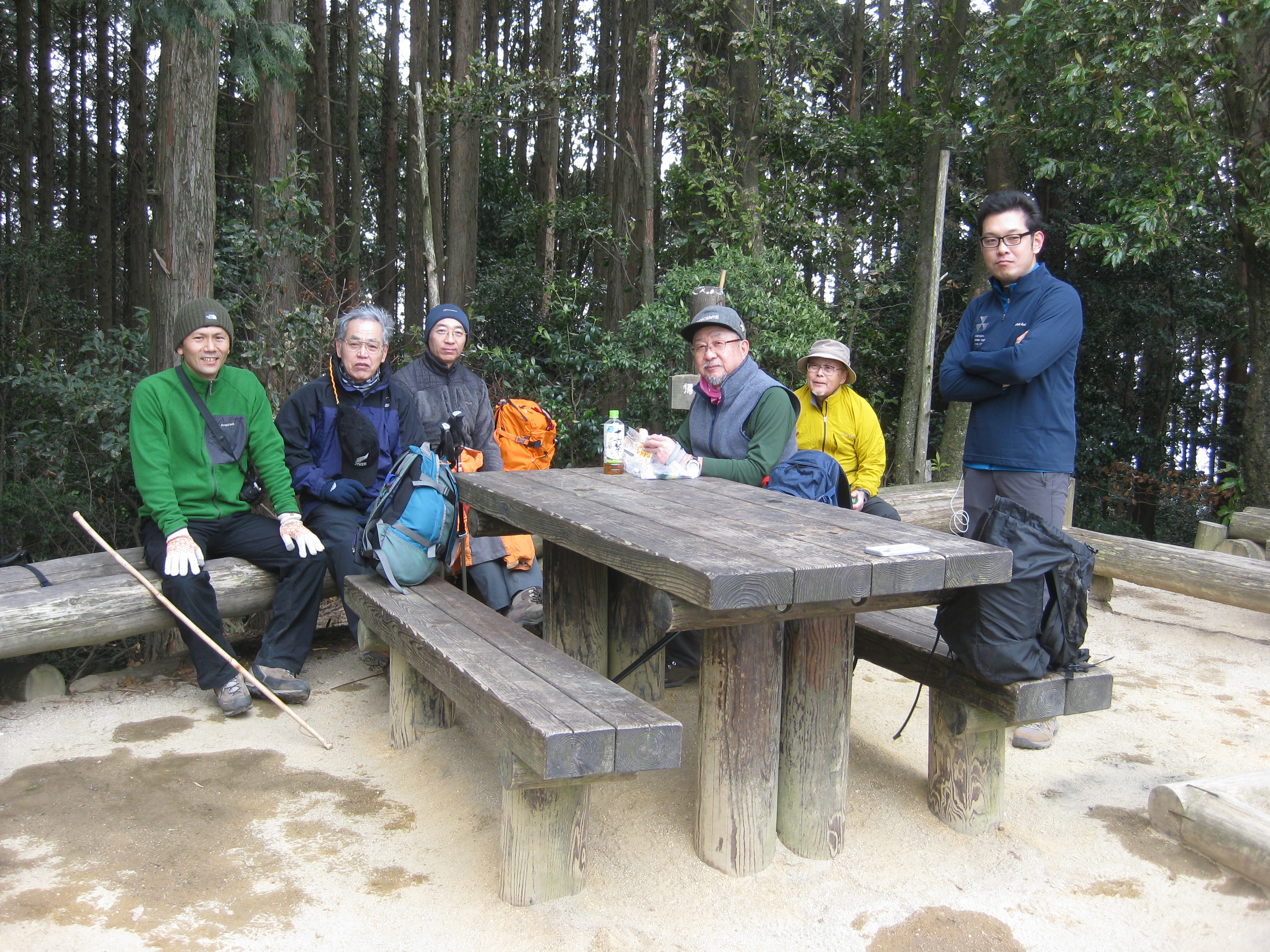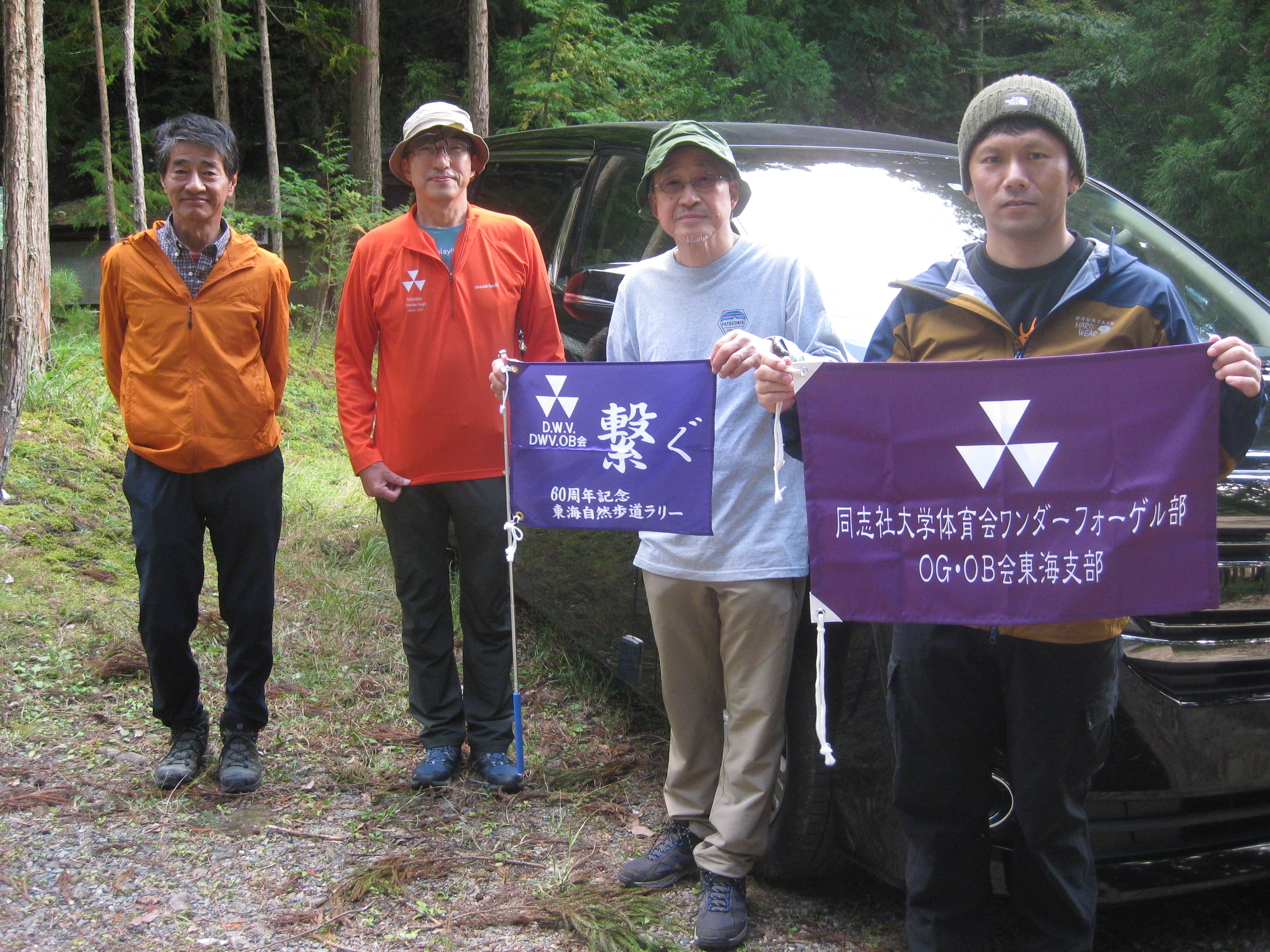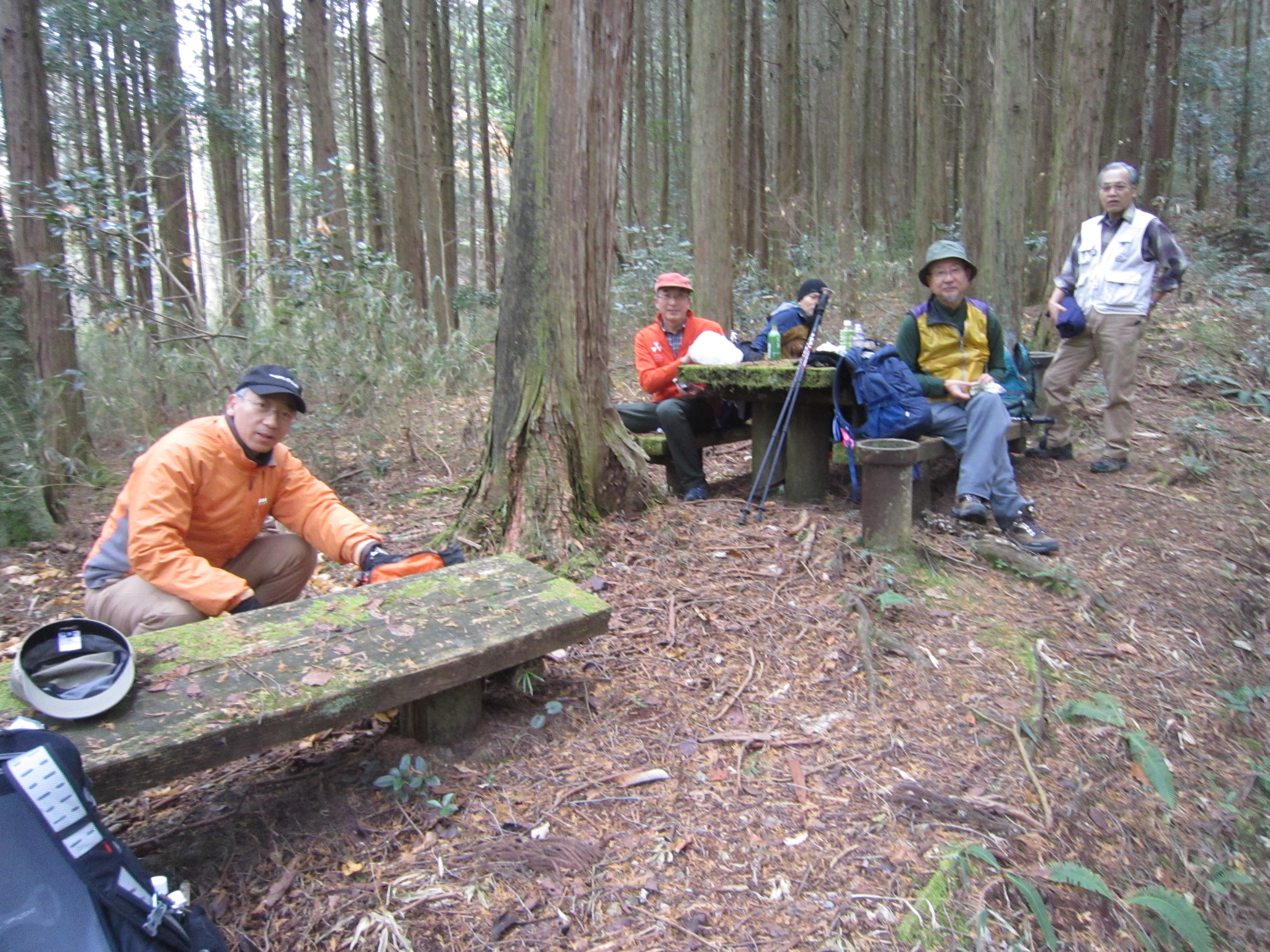 前回ゴールの足助八幡宮前に9時30分集合、予報より早く雨が降っている。8回実施中3回が雨、誰が雨男か! 9時45分出発、10時20分安実京町到着する。ここまではロード。ここから山道に入いり高度を稼ぐ。再びロードとなり外国人女性の単独ハイカーとすれ違い、地元の人に「頑張って」と声をかけられる。老さわらの巨木を過ぎ、11時10分室口町分岐に出、公民館の軒先にてダウン。雨の降り続く中を12時30分平勝寺到着、ここでも本堂軒先をお借りして腹ごしらえする。予定より順調なため金蔵連峠でのタクシーを1時間早めの15時に変更連絡を入れる。12時55分出発、ロード・山道を繰り返す。山道は雨水が流れ、さながら川の様相をなしている。13時50分金蔵連峠まで50分の表示がある道標にて最後のダウン。14時45分真新しいトイレのある金蔵連峠に到着する。すぐにタクシーが到着し、足助バス停に向かう。